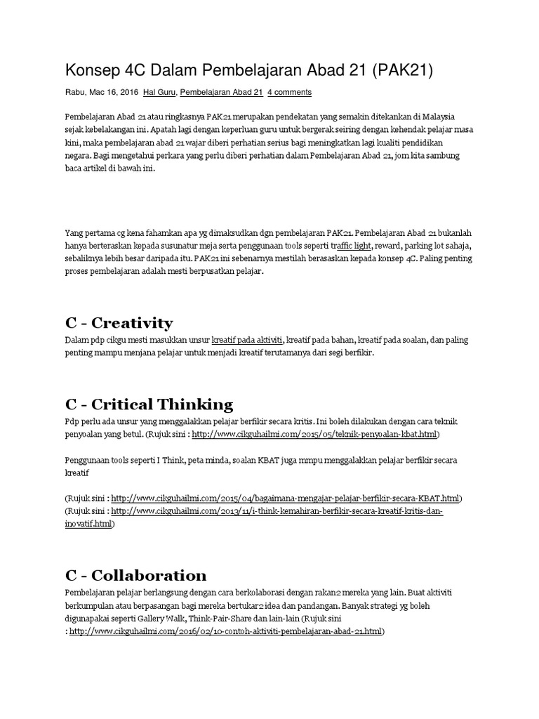 Bernama Pkp Guru Laksana Aktiviti Pembelajaran Abad Ke 21 from bernama.com Terutama pada ranah komunikasi yang telah masuk ke sendi kehidupan, maka dari itu siswa diharuskan untuk bisa menguasai empat keterampilan belajar. Pada kurikulum 2013 diharapkan dapat diimplementasikan pembelajaran abad 21. Pengajaran & pembelajaran abad 21 kursus pembangunan guru mrsm kuala krai. • 1 2 3 sumber: Yakni telah berada pada revolusi industri 4.0. Critical thinking and problem solving. Pjbl = projec basic lerarning atau berbasis projek. Beberapa kompetensi penting yang dibutuhkan pada abad 21 yaitu: