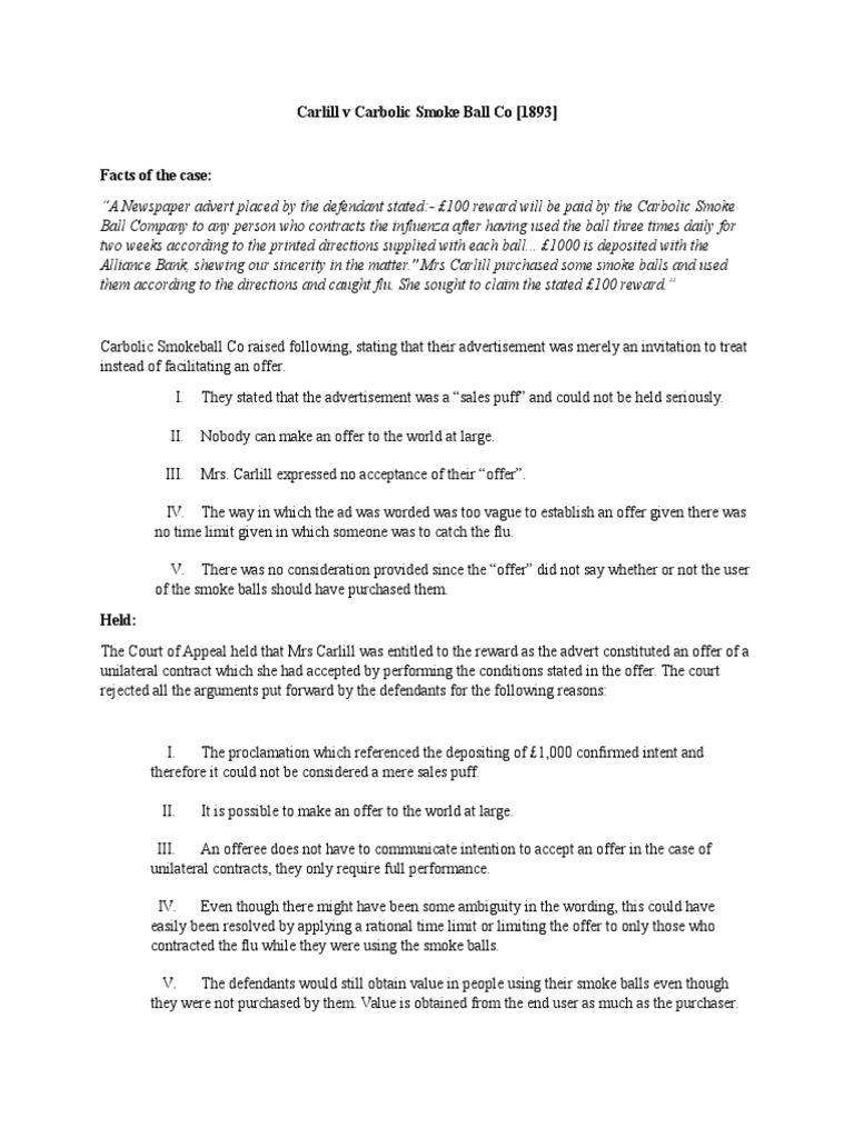 The carbolic smoke ball was a hollow rubber ball, 5 centimetres across, with a nozzle covered by gauze. The company placed ads in various newspapers offering a reward of 100 pounds to any person who used the smoke ball three times per day as directed and contracted influenza, colds, or any other disease. Carlill v carbolic smoke ball co a unilateral contract. Julie accepted and acted according to leila's advertisement. Infobox court case name = carlill v. The carbolic smoke ball co produced the 'carbolic smoke ball' designed to prevent users contracting influenza or similar illnesses. After carefully reading the instructions, she diligently dosed herself thrice daily until 17. Paterson, robertson & duke, principles of contract law (lawbook co, 3rd ed, 2009), p. 256 (c.a.) facts the plaintiff, mrs. This information can be found in the textbook: Banks pittman for the plaintiff. Has been published under the terms of the creative commons attribution 3.0 (cc by 3.0) for guidance on citing carlill v. Valliant nyambiya assignment 1 carlill v carbolic smoke ball company (1893) carlill v.