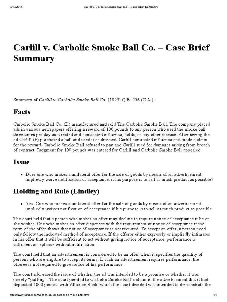 Chapter 2 Contract Law from kfknowledgebank.kaplan.co.uk V meadows (dennis) and others. Carlill v carbolic smoke ball company 1892 ewca civ 1. Carbolic smoke ball company court = court of appeal (civil division) date filed = date the carbolic smoke ball company made a product called the smoke ball. Valliant nyambiya assignment 1 carlill v carbolic smoke ball company (1893) carlill v. The carbolic smoke ball was a peculiar device marketed as a cure for various ailments including influenza. In a third letter, the company claims that it had absolute confidence in the smoke ball's efficacy, but ''to protect themselves against all judgment for 100 pounds was entered for carlill. Louisa elizabeth bought a smoke ball after seeing the advertisement made by the defendants who were a medical company under the. She claimed £100 from the carbolic smoke ball company.