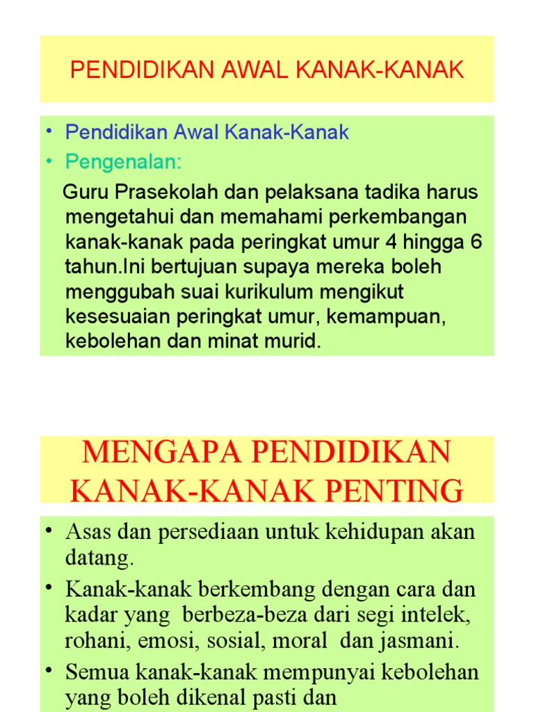 Penubuhan Pusat Pendidikan Awal Kanak-kanak from demo.dokumen.tips Jabatan pendidikan jasmani & kesihatan Dewan bahasa dan pustaka, edisi keempat menyatakan : Perkembangan merujuk kepada perubahan fizikal, mental dan sosial yang dapat dijangkakan dalam kehidupan bayi. Thus, the programme strives to develop the capacities and competence of early childhood education undergraduates to enhance the quality and standard of early childhood education in malaysia resulting in greater. Latar belakang intervensi awal bt mahdzir 4. Siti aishah bt 1.definisi sunsudin 2. Bidang ini mempu memberikan peluang pekerjaan kepada semua pendidik di sesebuah negara. Peringkat pertama bermula dari 0 hingga 3 tahun, dan